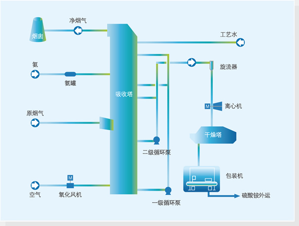 采用飽和結晶工藝,吸收系統產生一定固含量的硫酸銨漿液,再進行固液分離、干燥和包裝,產出商品硫酸銨;采用蒸發結晶工藝,則是設置蒸發結晶系統對吸收系統產生的硫酸銨溶液進行蒸發結晶,再進行固液分離、干燥和包裝,產出商品硫酸銨。