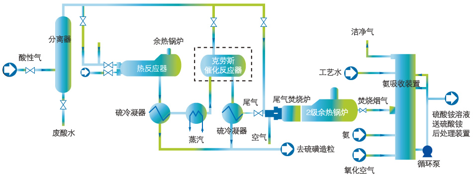 煤化工低溫甲醇洗、酸水汽提、煉油酸水汽提及溶劑再生裝置產生富含H2S、有機硫的酸性氣。江南環保酸性氣處理技術采用克勞斯硫回收+氨法脫硫技術處理酸性氣,與傳統兩級克勞斯+SCOT、三級克勞斯+SCOT、超級克勞斯、超優克勞斯工藝相比,不僅能夠達標排放,而且還有較大提標空間,副產硫酸銨,變廢為寶,實現循環經濟。
