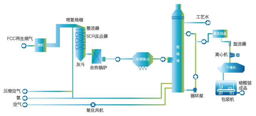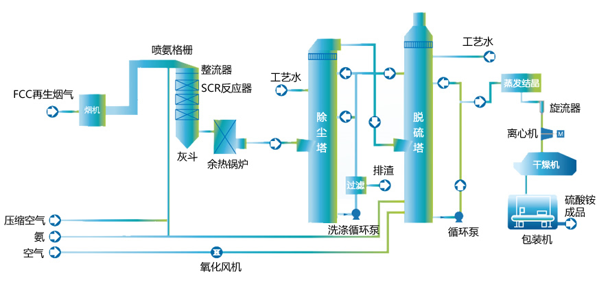 催化裂化的再生煙氣經煙機、高溫鍋爐回收能量后,在300℃~420℃溫度下進入SCR反應器,在催化劑作用下,煙氣中的NOx與NH3反應生成N2和H2O;脫硝后煙氣經低溫鍋爐回收熱量后進入布袋除塵器,經布袋除塵后進入脫硫塔,脫硫后的凈煙氣經脫硫塔塔頂直排煙囪排放。煙氣中的二氧化硫在脫硫塔內被吸收,生成的亞硫酸銨溶液經氧化、濃縮,送入蒸發結晶系統,得到一定固含量的硫酸銨漿液。硫酸銨漿液再經旋流器、離心機、干燥機后,得到水分<1%的硫酸銨,再進入包裝機包裝,得到產品硫酸銨。工藝過程無廢水排放。